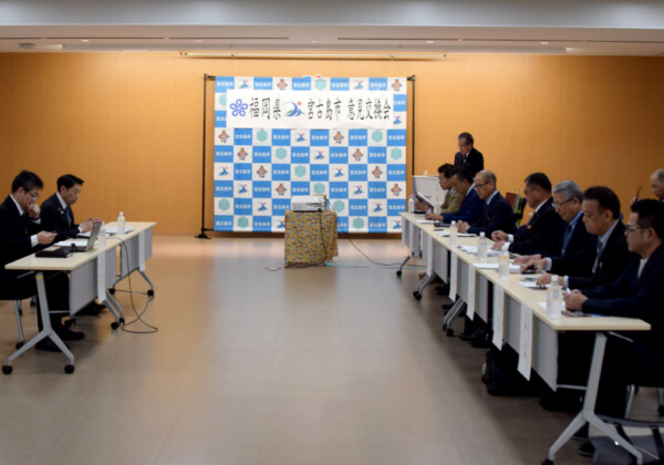 福岡県の服部誠太郎知事は17日、市役所を訪れ、台湾有事などを念頭に置いた住民避難の受け入れを巡り、嘉数登市長らと意見交換を行っ...