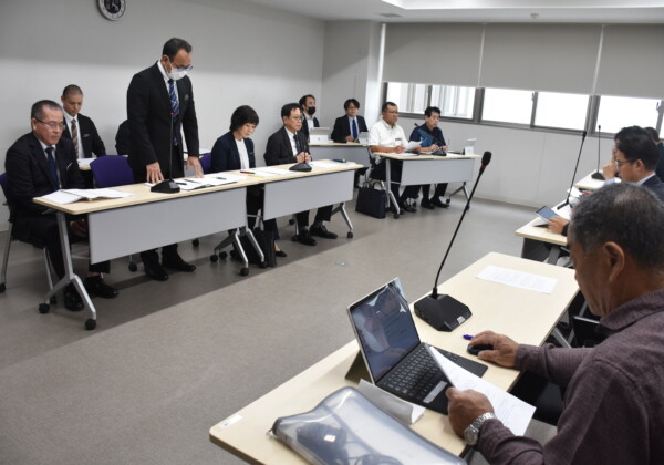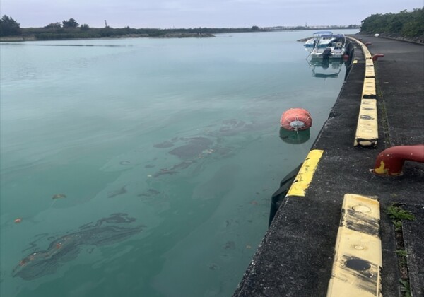 下地の川満漁港内の海上で27日、「油のようなものが浮いている」と一般人から通報があった。宮古島海上保安部職員が現場に急行して調...
