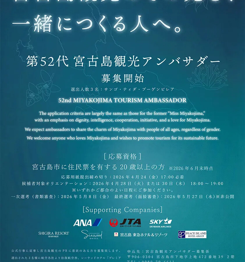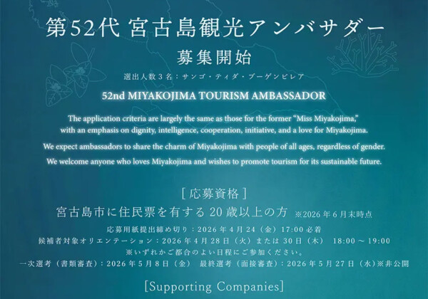 一般社団法人宮古島観光協会は、宮古島観光のPRを担う「第52代宮古島観光アンバサダー」の募集を開始した。選出される3人は「サン...