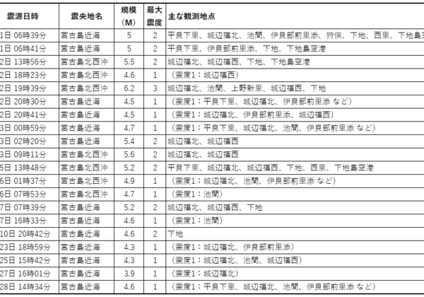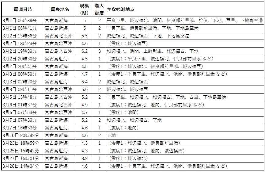 宮古島地方気象台は14日、2026年3月の宮古島地方の地震活動図をまとめた。それによると、今期間中に同地方で震度1以上を観測し...