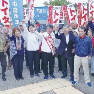 玉城デニーさん (62) の宮古選対は午後0時半から、 TSUTAYA宮古島店前交差点で出発式を実施。 本部長の國仲昌二県議やワンチームみゃ~くの新里聡共同代表、 伊川秀樹副市長がマイクを握ったほか、 玉城さん本人からもメッセージが届けられた。 集まった大勢の支持者らはガンバロウ三唱で団結し、 2期目の必勝を誓った。