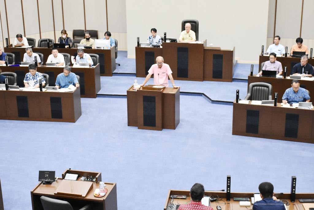 宮古島市議会(平良敏夫議長)9月定例会は9日、当局が提案した予算議案などに対する質疑が行われた。2024年度に実施した物価高騰対応重点支援地方創生臨時交付金事業で不適切な事務処理により補助金が受け取れなかったとして嘉数登市長の給与を減額する条例議案に5人の議員が質問。嘉数市長は事務処理ミスの再発防止に向け、職員に対して事務、組織、予算など管理を徹底するよう訓示したと述べた。市の答弁では関わった職員7人の処分は訓告としたという説明もあり、山下誠氏の検証チーム設置の質問には「検討していきたい」と述べた。