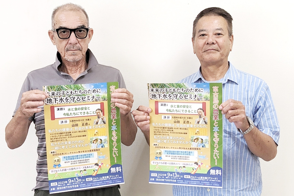 13日開催のセミナーへの来場を呼びかける野原さん(左)と嵩原さん =宮古新報社 未来の水と食を考える場に 地下水守る会 13日ドームでセミナー開催 2025.09.09 94 views Tweet Share Hatena Pocket RSS feedly Pin it このコンテンツを閲覧するにはログインが必要です。お願い ログイン. あなたは会員ですか ? 会員について Tweet Share Hatena Pocket RSS feedly Pin it 社会・一般 職場体験前に予行演習 宮総実生が先生役 久松中にマナーの授業 下地っ子バレー初出場で3位 フェニックス、九州で羽ばたく 関連記事一覧 県内商工会で初認定 伊良部商工会 健康経営優良法人... 2024.03.27 農作業に潜む感染症リスク 24年度宮古保健所運営協 ... 2025.03.05 73,596人で33%増 6月入域観光客数 2023.07.22 新型コロナ18日、宮古島市は3人【速報値】 2022.11.18 観光収入8563億円最高 県23年度速報値 24年度は目標8... 2024.07.27 請求処理円滑化へ公開 減算・標準に分類し コード表... 2025.06.14 安定経営への知識磨く 新規就農サポ講座第5回 2025.10.17 アイランダー2009、全国へ宮古をピーアール 2009.11.30