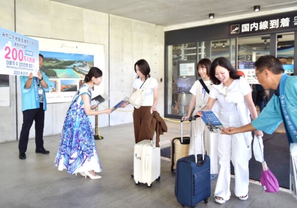「みやこ下地島空港ターミナル」の累計旅客数が9月19日、開業から約6年半で200万人に到達した。1日、運営する下地島エアポートマネジメント(SAMCO)や市、宮古島観光協会の職員らが国内線到着棟出口で乗客に記念品を手渡し、来島を歓迎した。