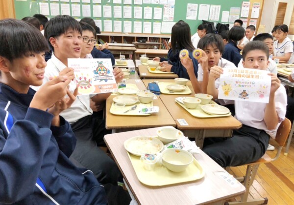 1日に市制施行20周年を迎えた宮古島市は、この日の学校給食で周年を記念した「お祝い献立」を実施した。