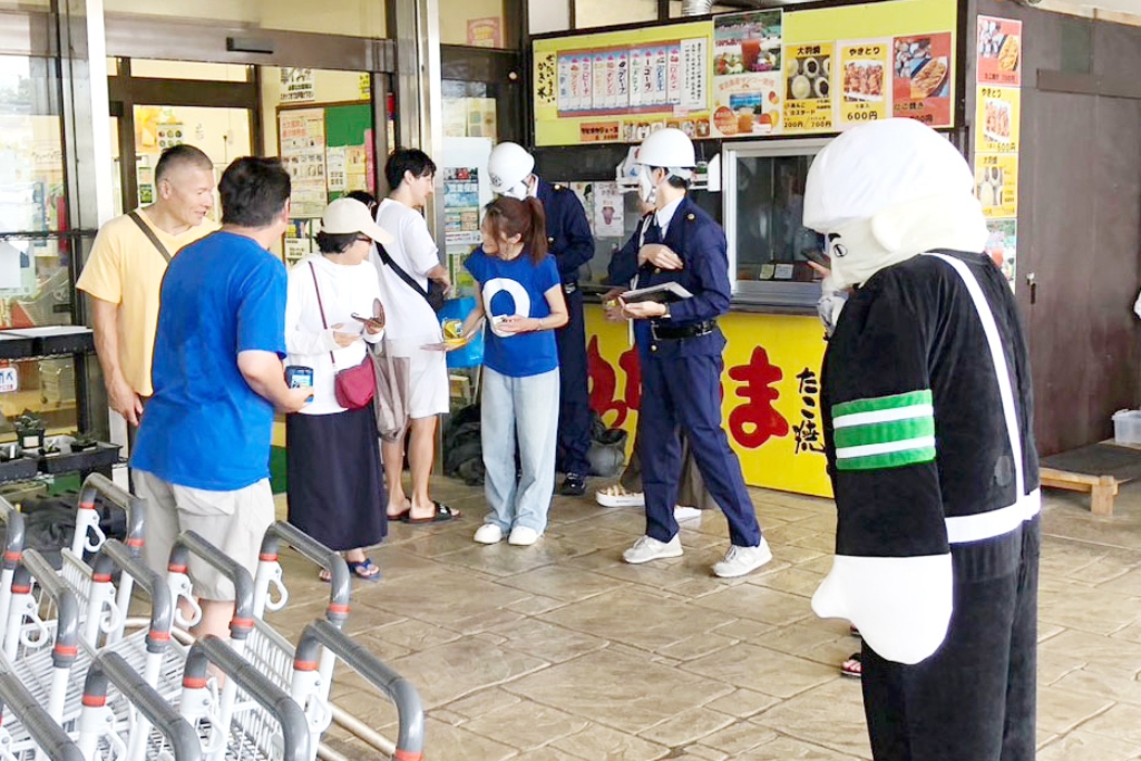 宮古島まもる君たちが来店者に交通安全を呼びかけた