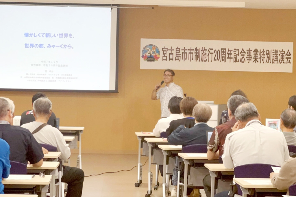 宮古島市は3日、市制施行20周年記念事業特別講演会を市役所で開いた。国土交通省総合政策局モビリティサービス推進課長の星明彦氏が講師を務め「懐かしくて新しい世界を、世界の都みやーくから。」の演題で参加した市職員や自治会関係者、市議会議員らに向けて解説。過疎・過密の同時進行や若者の流出、物価高騰など地域課題に触れつつ、宮古島の未来像や「世界の中の宮古」の可能性を探る内容となり、質疑応答も交えて活発な意見交換が行われた。