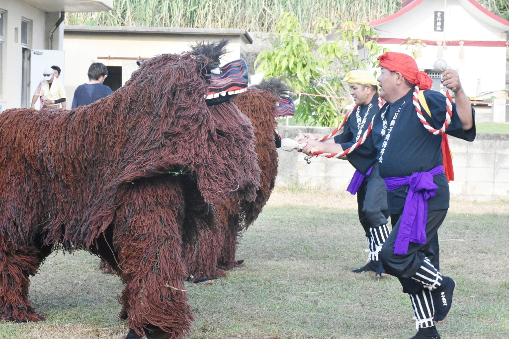 豊年祭では始めに同センターそばの下里添神社で神事を執り行ったあと保存会メンバーによる獅子舞を奉納。移動した広場では獅子を囲んだ踊りのあと2人の男性が左右に跳びはね獅子を誘導し、鉦やホラ貝などが鳴り響くなか獅子が荒々しく踊った。