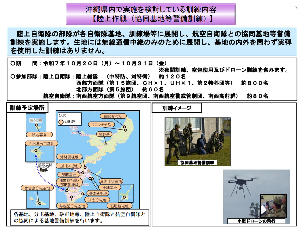 沖縄防衛局は「訓練は国民の安全・安心の確保に資するものであり、住民生活に影響のないよう十分に配慮して実施する」と説明している。