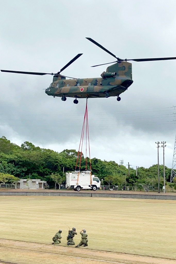 そのうち、八重瀬町の東風平運動公園を会場に行われた訓練では自衛隊や通信事業者、関係機関が連携し、災害で道路が寸断された場合を想定した車両の空輸訓練を実施。大型輸送ヘリによる通信機材車両の吊り上げ搬送を実演し、空からの物資・通信支援体制の有効性を確認した。