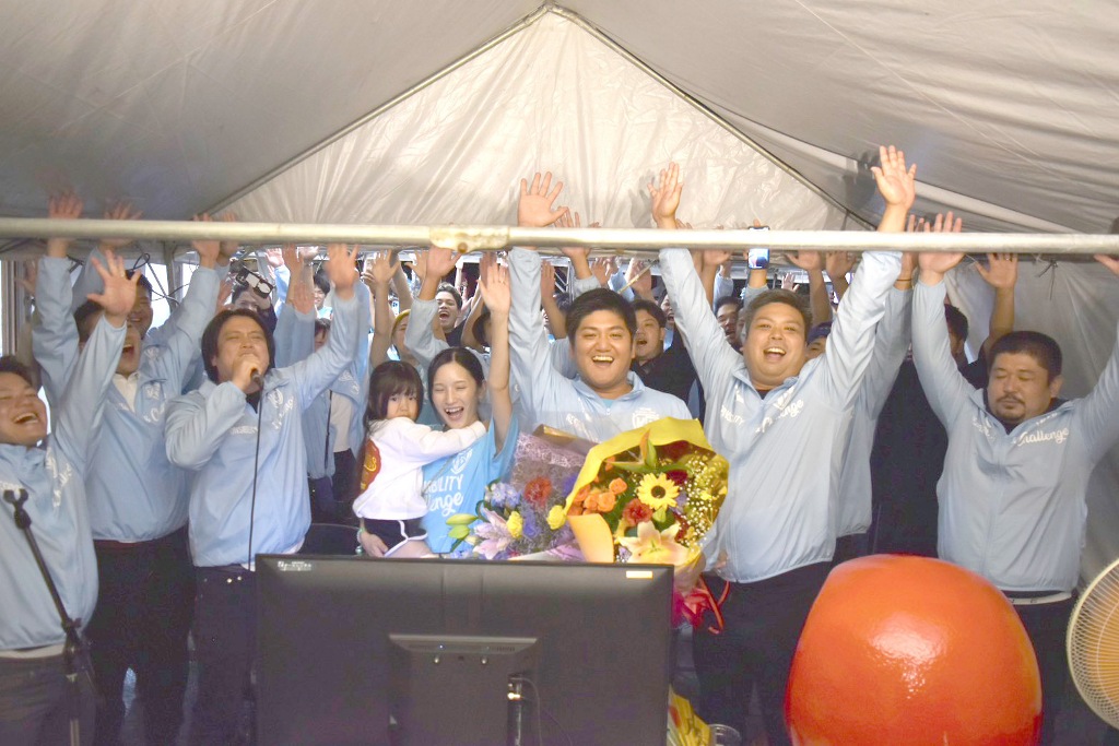 喜びの中、あいさつした大城さんは「トップ当選させていただきありがとうござました。同級生がたくさん動き、先輩方が支えてくれた」と感謝の気持ちを伝えた。