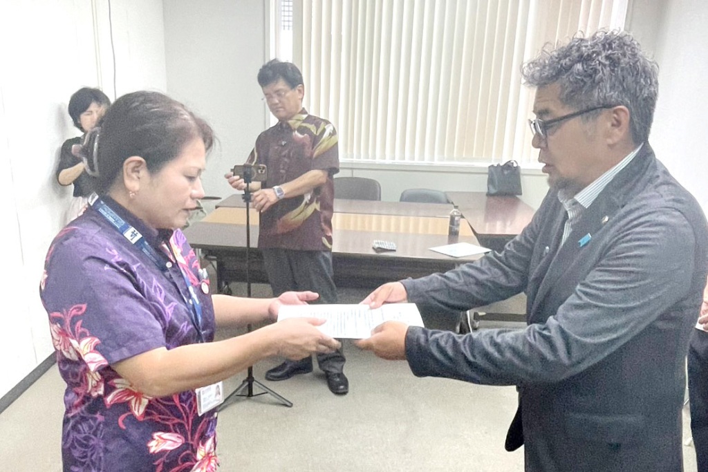 仲間会長は提出時、「同じ沖縄県民として非常に危機的な状況だと感じている。家族や子どもたちの将来を守るためにも、県として共通の意識を持って対応してほしい」と訴えた。川満市議も「私たちは日本に生まれ育った県民。玉城知事は曖昧にせず、明確な見解を示すべき」と求めた。