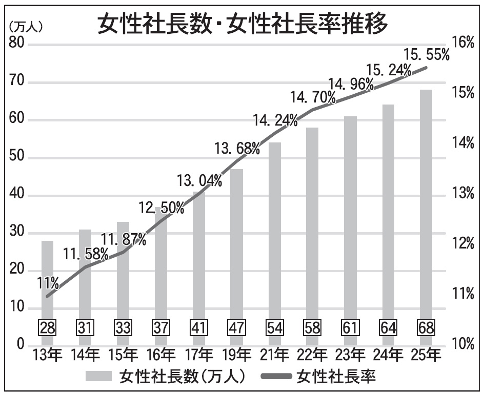 同社の調査は全国約440万社を対象に実施。女性社長数は15年前の10年(21万2153人)に比べ約3・2倍に増加。業種別では「サービス業他」が最多の34万3476人(構成比50・1%)で、飲食・宿泊業や介護事業など生活関連分野に集中している。