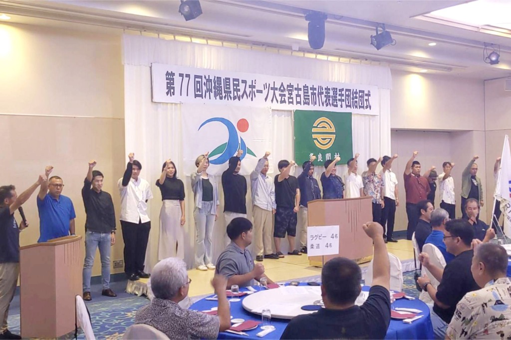 第77回県民スポーツ大会に出場する宮古島市代表選手団の結団式が7日夕、平良下里のホテルで開かれた。主催は宮古島市スポーツ協会(砂川恵助会長)。計366人(選手・監督ら361人、本部役員5人)に及ぶ選手団のうち、式には代表者ら69人が出席。団旗授与や決意表明を通じて選手らは宮古の誇りを胸に、上位入賞への誓いを新たに大会への結束を強めた。