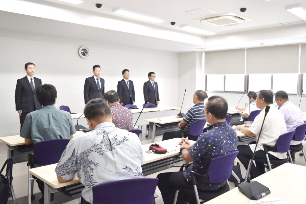 第十一管区海上保安本部が宮古島北西約40㌔の海上で実施した武器海上発射試験中、「地域航行警報」を誤って解除した事案について、宮古島市議会与党議員団は11日、市役所で宮古島海上保安部(丹野博信部長)から経緯の説明を受けた。海保側は「確認不足による人的ミス」として丹野部長らが謝罪し、再発防止に向けた具体策を報告した。