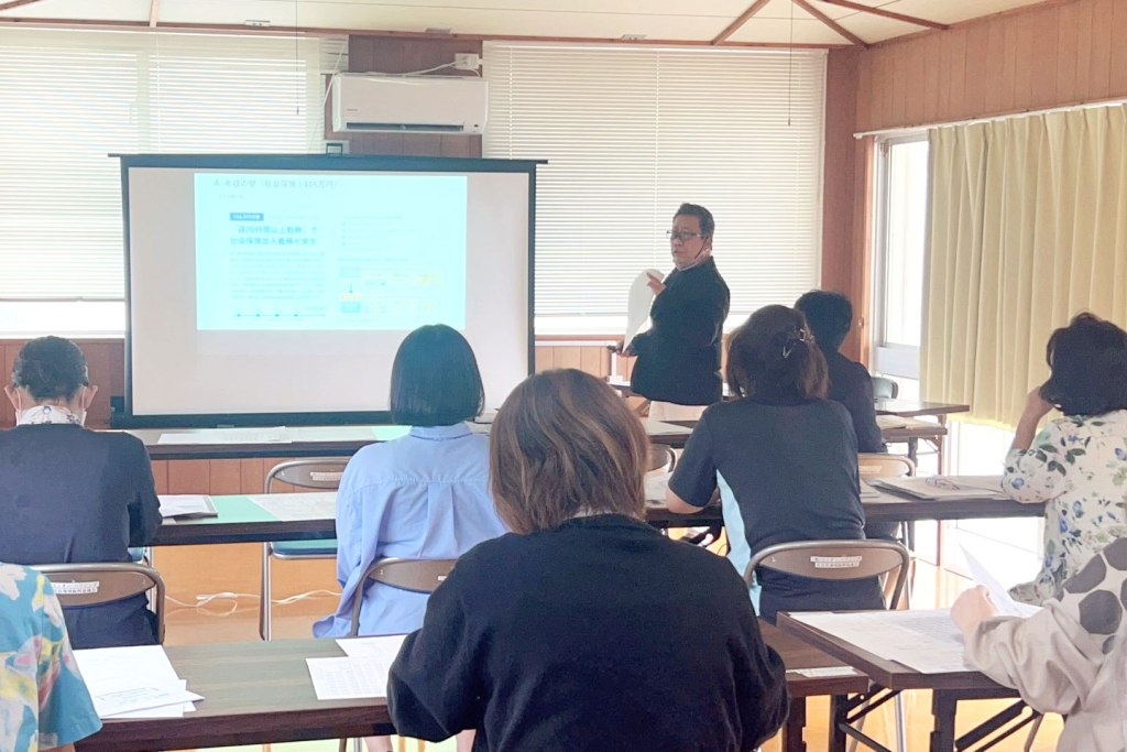 本研修は25年度経営改善普及事業の一環。高瀬所長は、近年注目される「年収の壁」問題を中心に、税金と社会保険の仕組みを解説した。住民税の非課税ラインが100万円から110万円に、所得税の扶養基準が103万円から123万円に引き上げられたほか、所得税がかからない基準も最大160万円まで拡大することが説明された。また、社会保険の加入義務発生ラインとして106万円・130万円・150万円の各壁が整理され、特に19歳以上23歳未満の適用範囲が130万円から150万円に引き上げられる点が強調された。