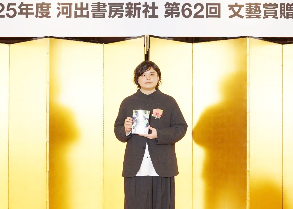 第62回文藝賞を受賞した宮古島市出身の作家・坂本湾(さかもと・わん)さん=本名・濱元優虎=の受賞作『BOXBOXBOXBOX』が17日、河出書房新社から刊行された。宅配所で働く4人と「箱」にまつわる謎を描いた作品で、選考委員が「新時代の労働を暴く力作」と高く評価した話題作。12日に都内で行われた贈呈式では選考委員から激励の言葉が相次ぎ、宮古島出身の新たな才能の誕生に注目が集まっている。21日には市内ホテルで受賞パーティーが開かれ、地元関係者らで祝福する。