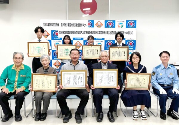 宮古島警察署は26日、同署で2025年度防犯功労団体・個人および全国地域安全運動ポスター、全国暴力追放運動標語の部県内入賞者への表彰伝達式を行い、長年地域の安全確保に取り組んできた団体・個人と、宮古地区から県内入賞した中学生らの功績をたたえた。