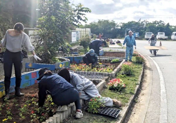 千代田開発が平良松原の海岸線道路沿いに整備した花壇に地域の任意団体らが協力して花苗の鉢上げ作業を実施し、道路沿いを彩った。