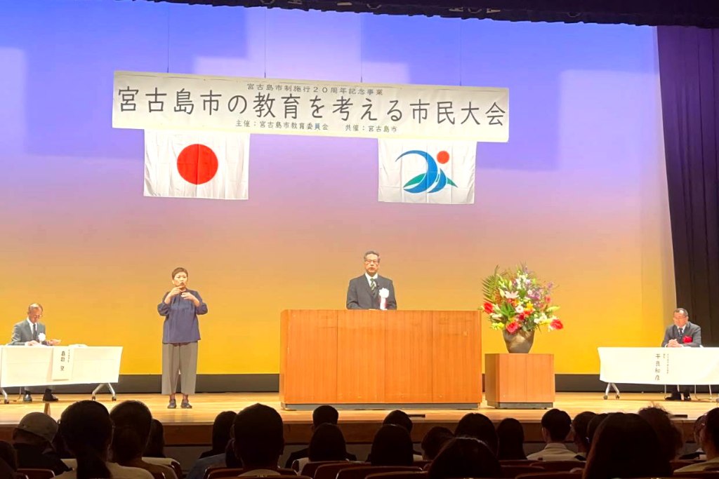 嘉数登市長は「未来を担う子どもたちの成長に、市民一人ひとりが関心を寄せてほしい」と呼びかけ、市議会の平良和彦議長も「家庭で教育について話し合う機会にしてほしい」と述べた。