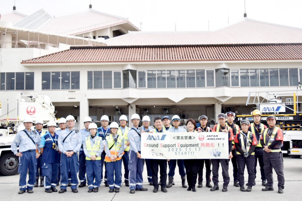 JALグループ宮古空港所(萩堂美枝子所長)とANA宮古空港所(玉城健二所長)は11日、宮古空港で地上支援機材(GSE)の共用化を開始したと発表した。ベルトローダー車やハイリフトローダー車、航空機けん引車など主要機材を両社で共同使用し、10月からのトライアル期間を経て、11月17日から本格運用に移行。現在ハイリフトローダー車は調整を進めており、12月末の本格導入を予定している。