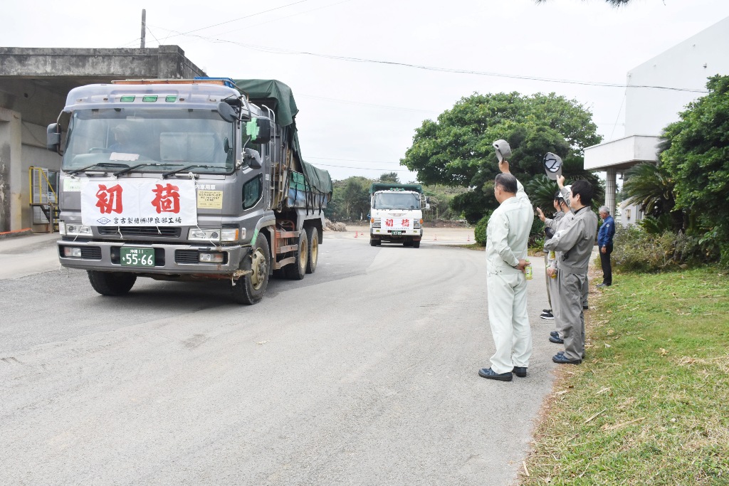 宮古製糖伊良部工場の分蜜糖初荷式は午前9時ごろから始まり、関係者が輸送の安全を祈願し分蜜糖を積んだダンプトラックを見送った。出荷量は約400㌧。長山港でダンプトラックから船に積み替えられた分蜜糖は千葉県の三井製糖に送られる。