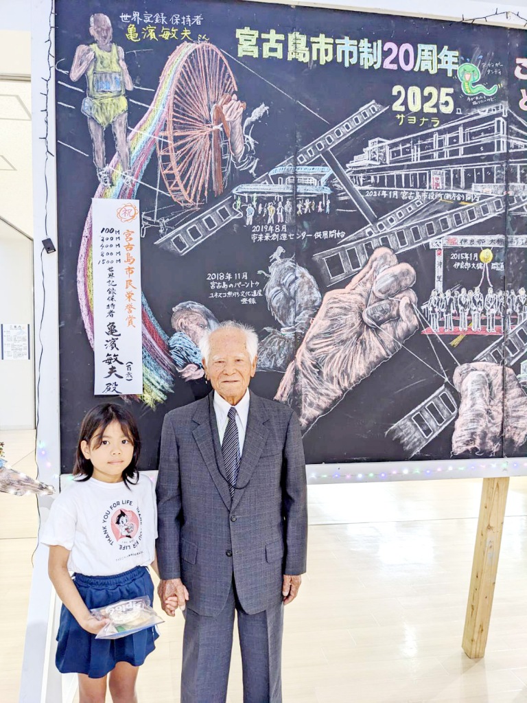 この日、亀濱さんはひ孫の佑里さん(9)とともに市長応接室を訪れ、嘉数市長からねぎらいの言葉と表彰状、記念品を受け取った。亀濱さんは「市長からこのような最高の賞をいただき、これ以上ない喜び」とコメント。