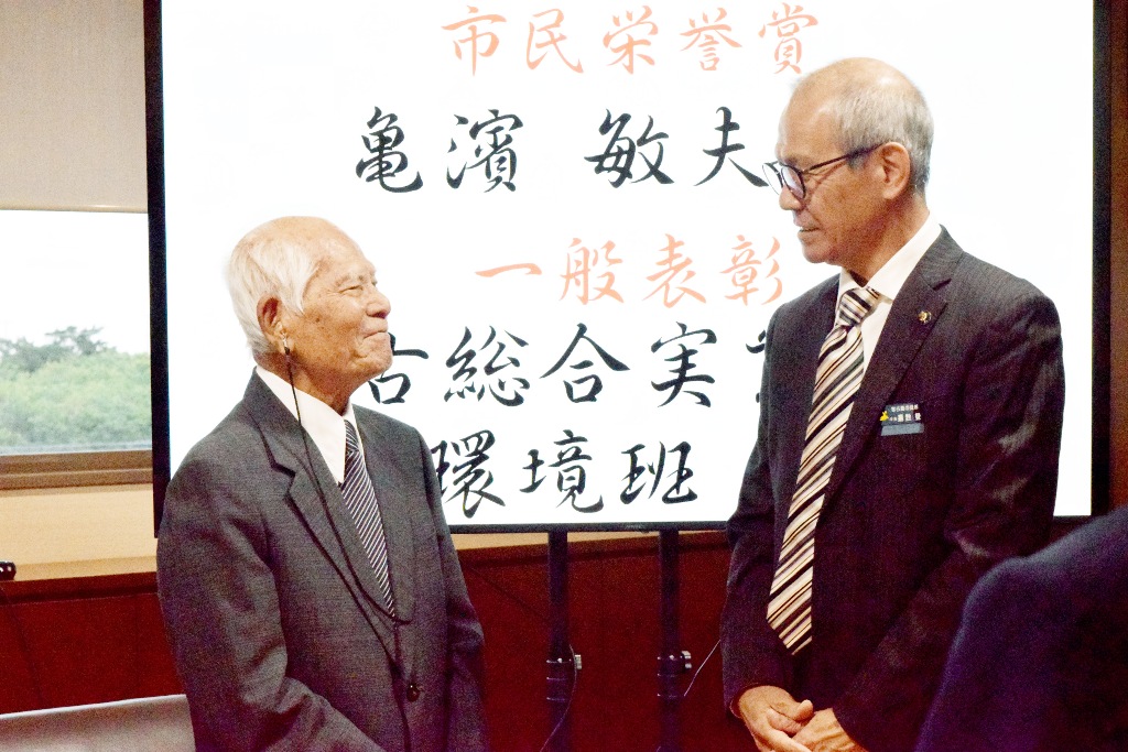 亀濱さんは先月2日に沖縄市で開催された第45回沖縄県マスターズ陸上競技選手権大会において、M100(男子100~104歳)クラスの100㍍に出場し、従来の記録を0秒25更新する26秒74の世界新記録をマーク。市民に大きな感動と希望を与えた功績がたたえられた。
