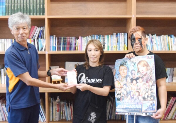 OZアカデミー女子プロレスの尾崎魔弓さんとクラッシャー前泊さんが7日、漲水学園を訪れ、来年1月18日にJTAドーム宮古島で行われる大会の観戦チケットとサーターアンダギー100個を子どもたちに贈呈した。