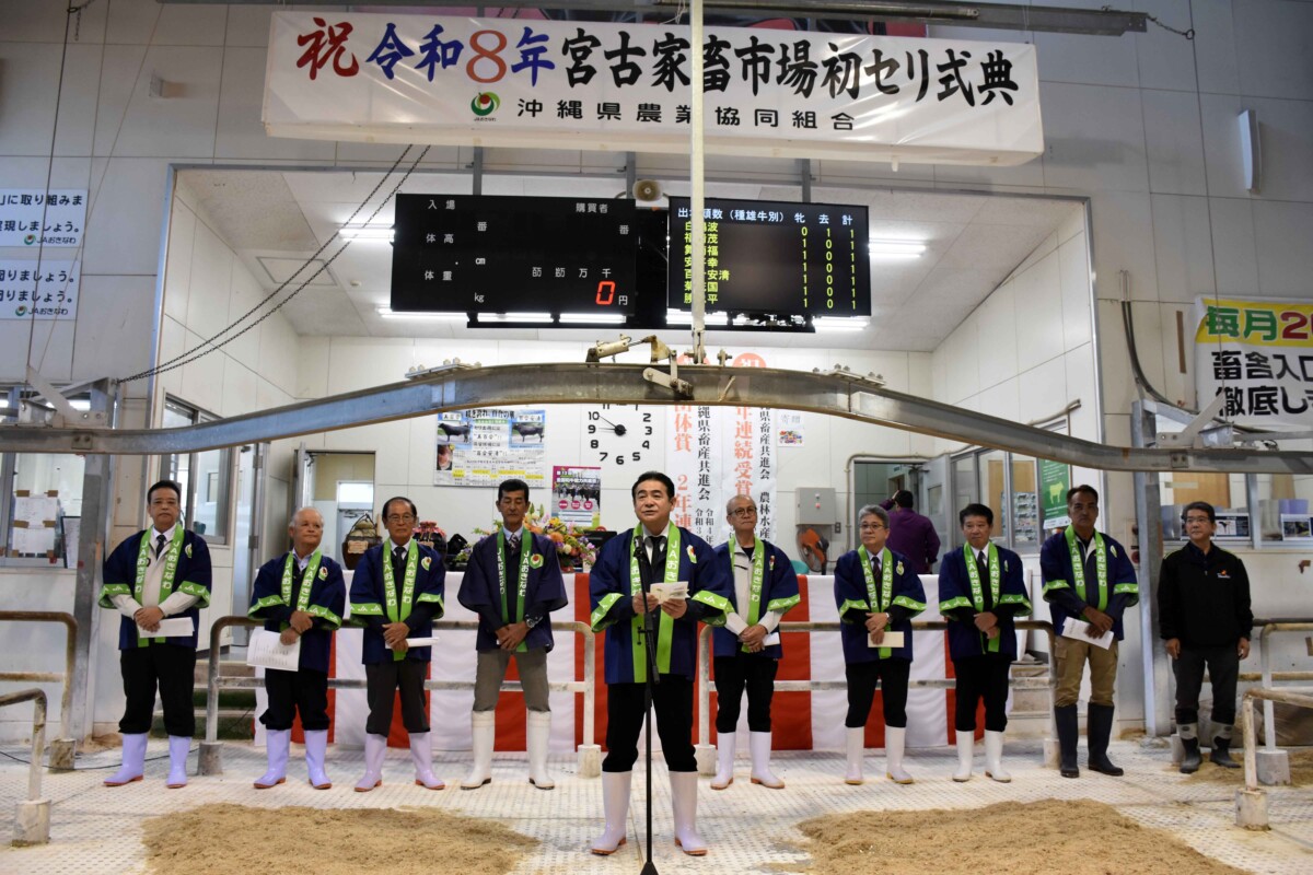 JAおきなわの「2026年宮古家畜市場初セリ」が18日、平良山中の同家畜市場で行われた。式典にはJAおきなわ、市、県、生産農家、購買者ら関係者が参加し、肉用牛の振興と高値取引を祈願した。引き続き行われた1月期肉用牛セリ市では荷川取広明さん(下地高千穂)が出品した1番牛「王子号」(去勢)が104万6000円(税抜き)の高値で落札された。近年、セリ価格は低迷していたが、昨年12月セリ市は3年7カ月ぶりに70万円台となったことから継続した高値取引が期待される。