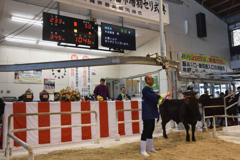 式典では、JAおきなわの浦崎進常務が生産者、購買者ら関係者の子牛畜産振興への尽力に感謝した上で「ここ数年は飼料価格をはじめ、あらゆる資材の高騰により畜産農家を取り巻く環境は厳しい状況が続いていた。直近では全国的な繁殖母牛頭数の減少により素牛の不足感からセリ価格の上昇が続いている。JAおきなわとしても活発なセリや生産農家、行政と連携した生産基盤を強化した農家所得の向上に取り組んでいきたい」とあいさつした。