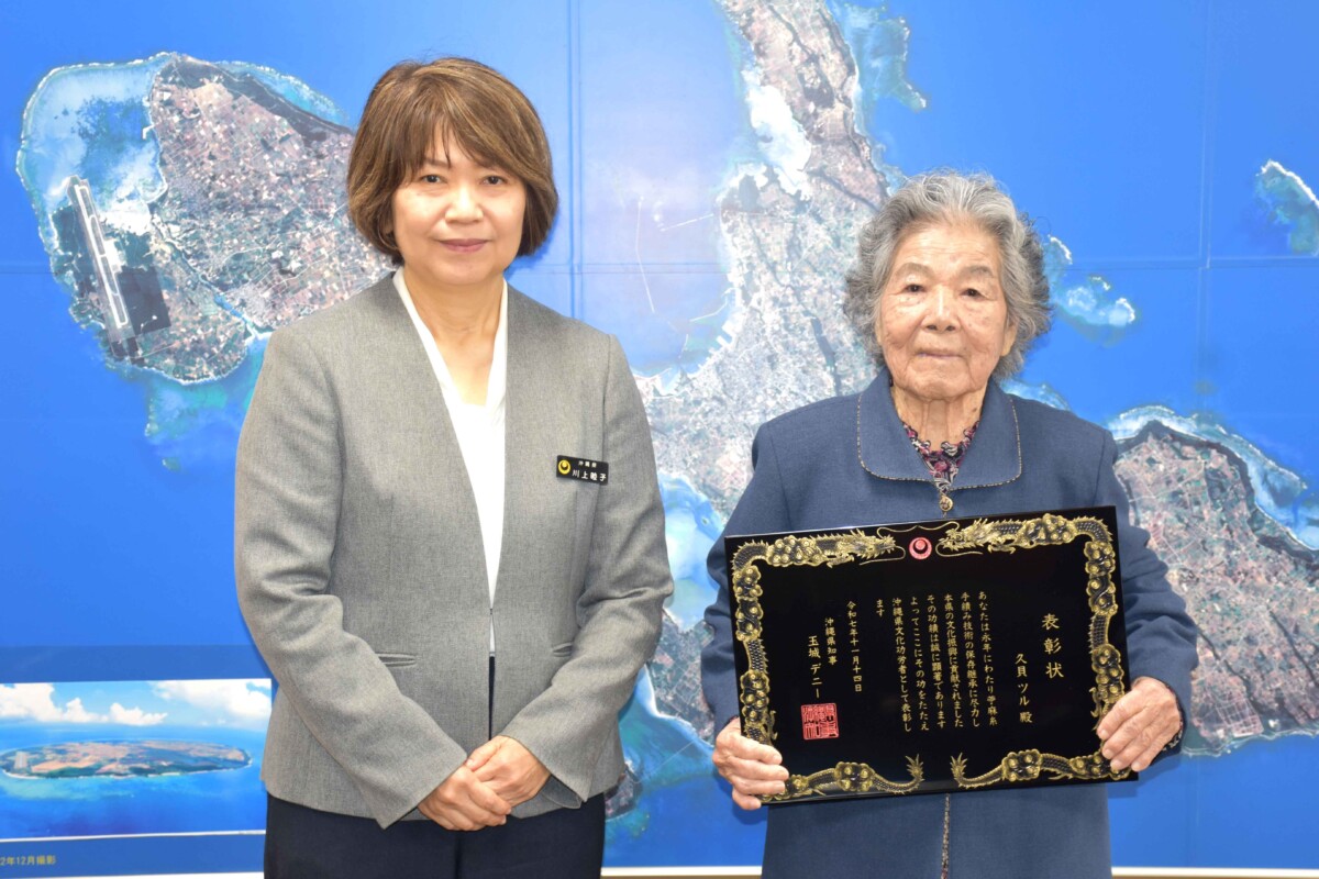 2025年度県文化功労者表彰伝達式が20日、県宮古事務所であり、川上睦子所長が伝統工芸(苧麻糸手績み)の久貝ツルさん(96)に表彰状を手渡した。宮古上布の原料となる糸を績んでいく技術を継承してきた久貝さんは受賞を喜び、「これからもできる限り続けていきたい」と話した。