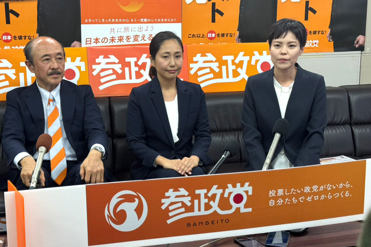参政党の立候補予定者の(左から)和田氏、吉田氏、仲間氏 =21日、県庁記者クラブ