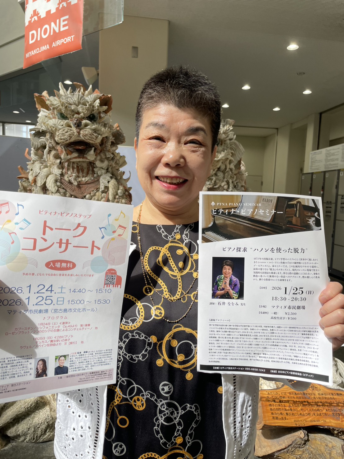 23日午後に来島した石井さんによる指導者や学習者を対象としたピアノセミナーも予定されている =宮古空港