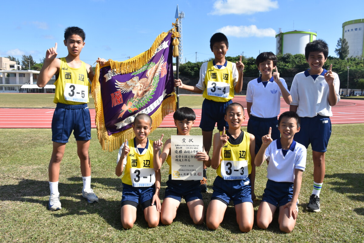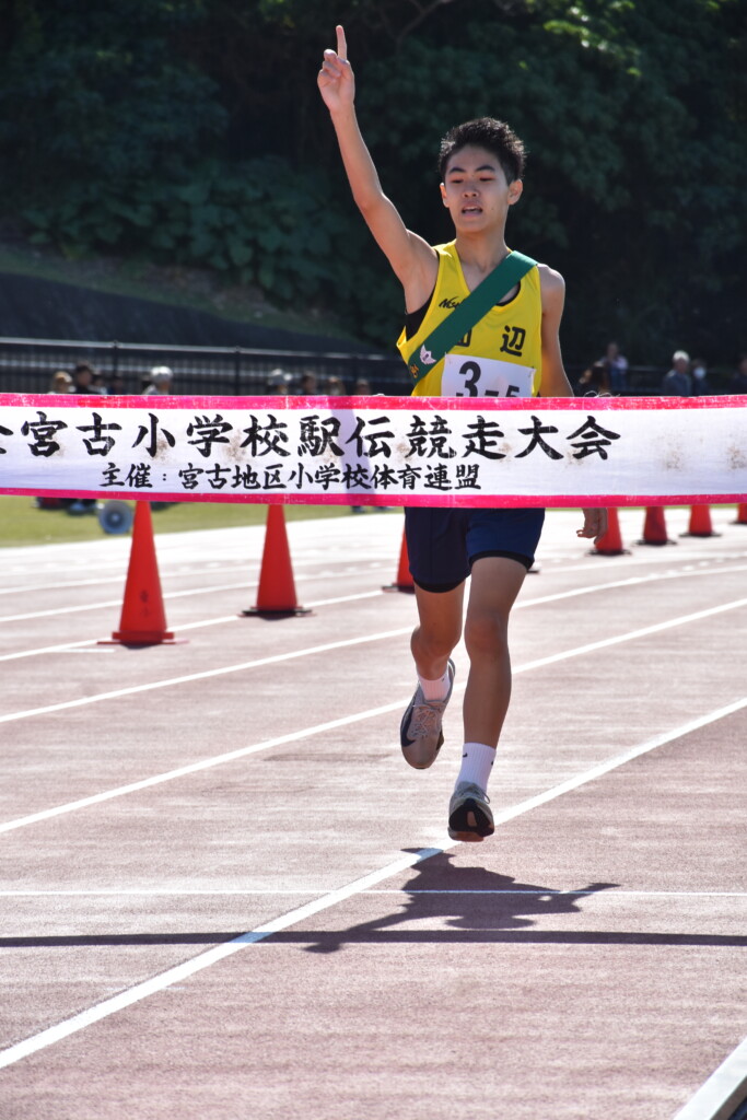 【区間1位】1区(1・6㌔)=三上穣太郎(平一A)5分17秒▽2区(1・2㌔)=仲間惺弥(西辺A)4分08秒▽3区(1・2㌔)=首藤煌乃介(西辺A)4分07秒▽4区(1・2㌔)=根間翔愛(上野A)4分16秒▽5区(1・6㌔)=砂川洋生(西辺A)5分20秒