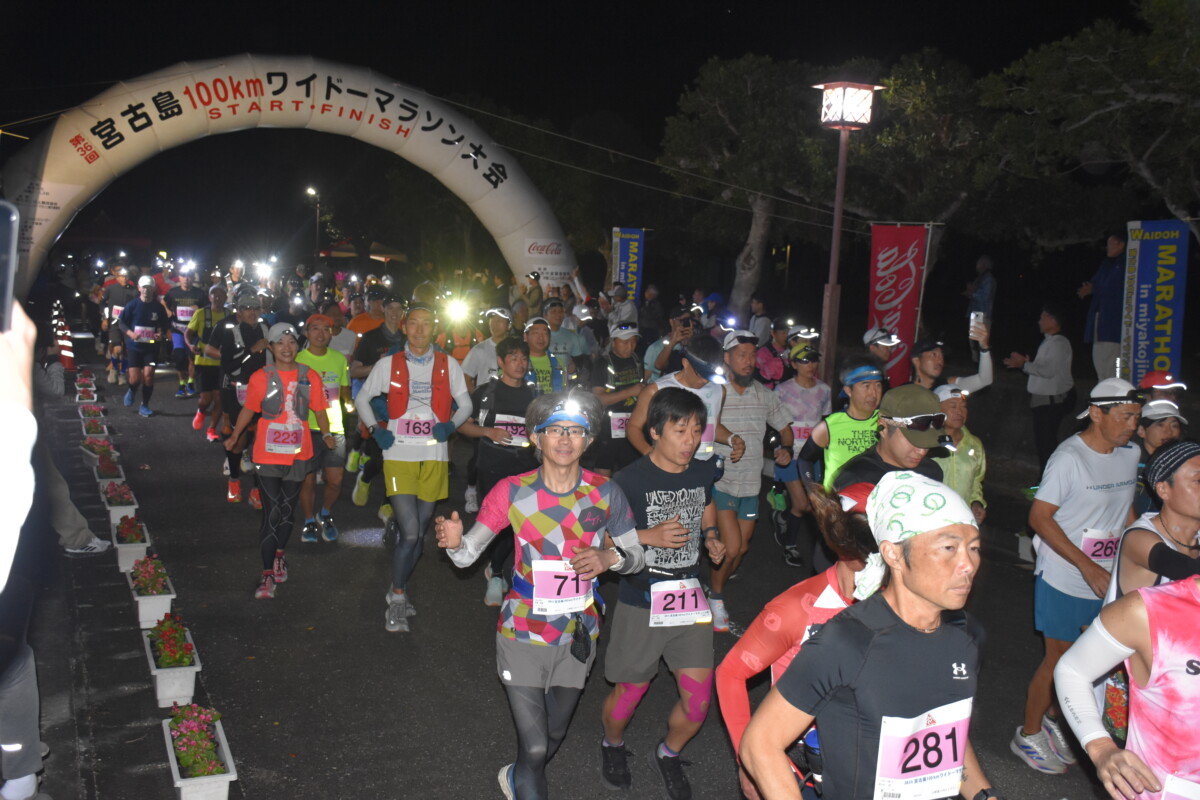 100㌔の部は午前4時40分から下地公園で開会式があり、嘉数登市長が「宮古島ならではの美しい景観と爽やかな海風を全身で感じながら気持ちよくコースを駆け抜けていただきたい。大会を通じてランナー同士の交流や地域ボランティアとの触れ合いを楽しみ日頃鍛え上げた健脚を発揮し思い出に残る感動のゴールを目指してほしい」と述べた。