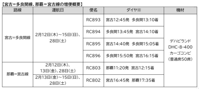増便されるダイヤは、宮古発が午後12時45分(RC893便)と午後2時40分(RC895便)。多良間発が午後1時45分(RC894便)と午後3時50分(RC896便)となっている。那覇―宮古線も12日、13日、28日を中心に1日1往復2便を追加する。