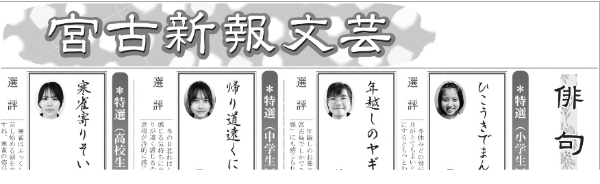 「冬の夜ココア冷めてく英単語」宮古高校2年 渡久山千尋 「冬の朝君の背見つけ急ぎ足」宮古高校2年 砂川寧々 「蜜柑剥く指にも染みる香りかな」宮古高校3年 砂川咲