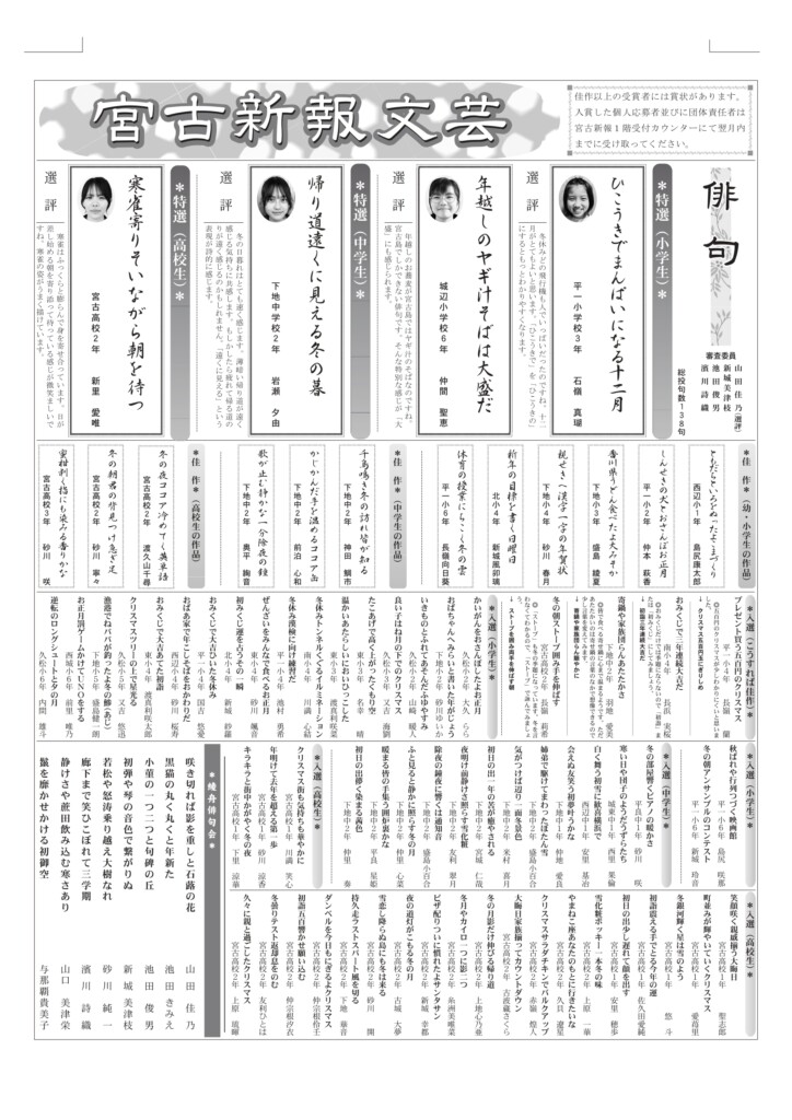 「かいがんをおさんぽしたよお正月」久松小2年 大久らら 「おばちゃんへみらいと書いた年がじょう」下地小2年 砂川ゆいか 「いきものとふれてあそんだふゆやすみ」久松小2年 山崎暖人 「良い子はね月の下でのクリスマス」久松小3年 又吉海劉 「たこあげで高く上がったくもり空」東小3年 名幸 晴 「温かいあたらしいにおいひっこした」東小3年 渡真利咲菜 「冬休みトンネルくぐるイルミネーション」南小4年 川満心結 「冬休み漢検に向け練習だ」平一小4年 池村勇希 「ぜんざいをみんなで食べるお正月」東小4年 砂川颯音 「初みくじ運を占うその一瞬」北小4年 新城紗羅 「おみくじで大吉ひいた冬休み」平一小4年 国吉悠愛 「おばあ家で年こしそばをおかわりだ」西辺小4年 砂川桜寿 「おみくじで大吉あてた初詣」東小4年 渡真利咲太郎 「クリスマスツリーの上で星光る」久松小5年 又吉悠迅 「漁港でねパパが釣ったよ冬の鯵(あじ)」下地小5年 盛島健一朗 「お正月罰ゲームかけてUNO をする」西城小6年 前里唯乃 「逆転のロングシュートと夕の月」久松小6年 内間雄斗 「秋ばれや行列つづく映画館」平一小6年 島尻咲那 「冬の朝アンサンブルのコンテスト」平一小6年 新城玲音