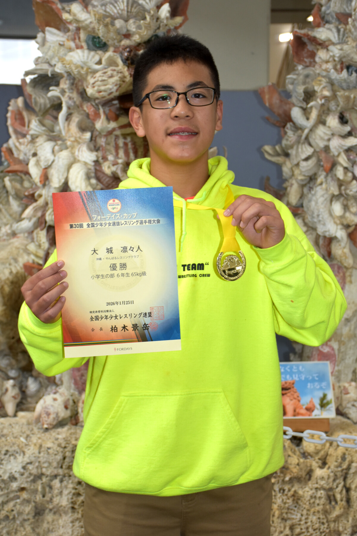 2026年フォーデイズ・カップ「第30回全国少年少女選抜レスリング選手権大会」が24~25日に東京の中央大学多摩キャンパスで行われ、小学生の部6年生男子65㌔級に出場した大城凛々人さん(平良第一小学校)が優勝を決めた。2連覇となった大城さんは夏の全国大会と合わせて今季全国2冠を達成。昨年度と合わせると4つ目の全国タイトルを手にした。