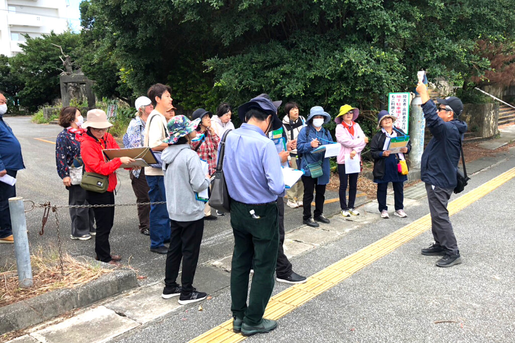散策の途中、要所では事前に配布された地図に記された地点で立ち止まり、当時の貴重な写真を提示。沖縄返還(1972年)以前から島に住む11人の参加者を中心に、写真と現在の景色を見比べながら、記憶の蓋を開けていった。