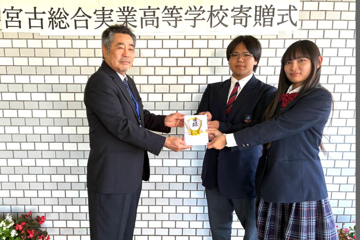 贈呈式では、同科代表者の仲本泰駕さんと下地茶花さんが「科の全員で活動しながら積み立てた寄付金です。宮古島市の困っている人たちのために役立ててください」と思いを語り、野原勝会長へ手渡した。