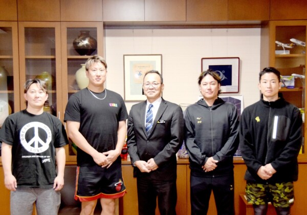プロ野球・オリックス・バファローズの杉本裕太郎、西野真弘、大城滉二の3選手が7日、市役所を訪れ、砂川朗副市長へ伊良部球場で行っている自主トレーニングの状況や島での手応えを報告した。