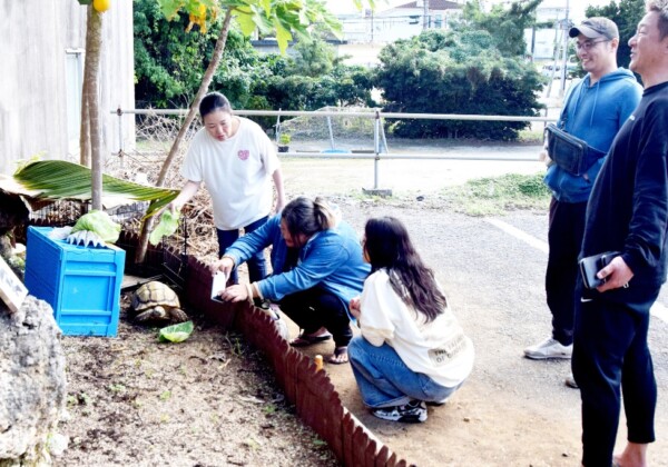 市平良東仲宗根の若松食堂で、年末にかけて来店客の注目を集めたのが、裏庭に暮らすリクガメの「そら君」だ。