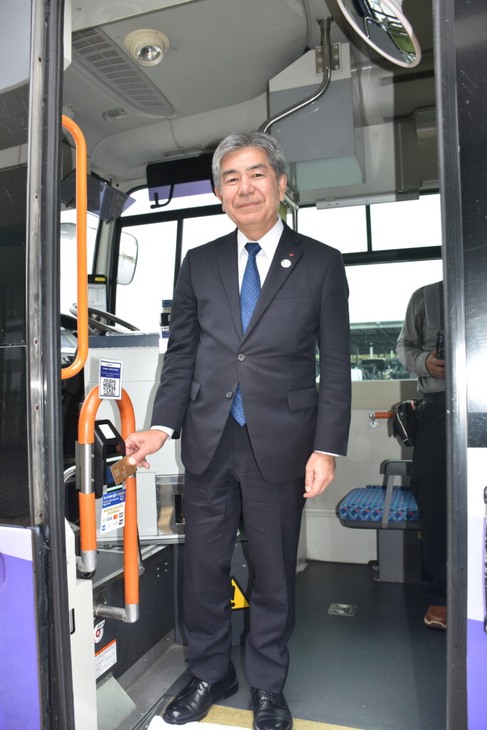 嘉数登市長は「4社全てがタッチ決済の利用ができるようになる。導入したバス事業者からは路線バスの利用者が増えたと聞いている。路線バスの利用促進や乗客の利便性向上につながることを期待している」と歓迎。同行の川上康会長は「タッチ決済乗車は利便性が向上するだけでなく(実証実験で)誰が、いつ、どの路線に、どの時間帯に乗ったかというデータが蓄積される。このデータを活用することで将来の路線の見直し、ダイヤ改正、観光路線の効率化などがより実態に即して可能になる」と述べた。
