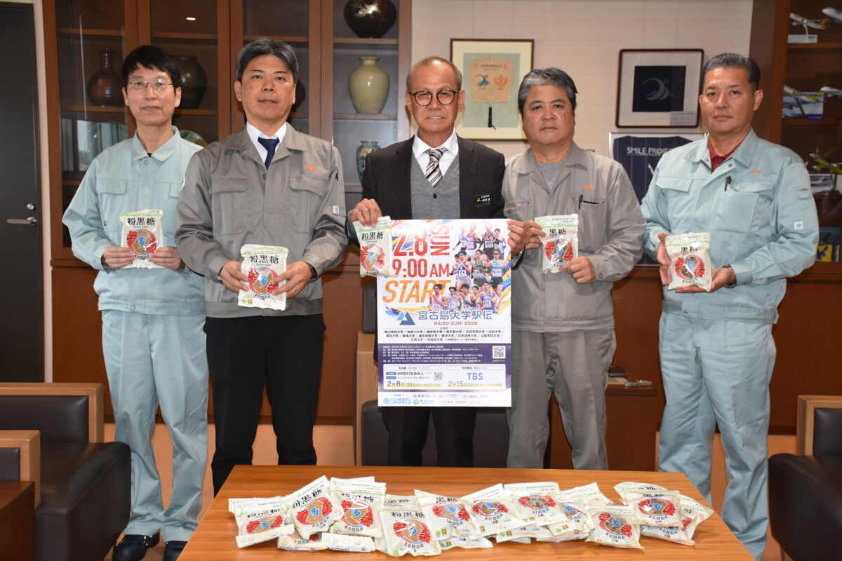 同社は市へ8ケース、チームには1ケース(20袋入り)ずつをそれぞれ贈った。山城社長は今期の製糖状況について「12月1日に城辺、伊良部の両工場で同時に製糖が始まり2カ月余がたった。12月は天候に恵まれなかったが、1月以降は天気も好天している」と振り返り、嘉数市長に市と大学駅伝に出場するチームへの多良間工場で生産した黒糖を手渡した。