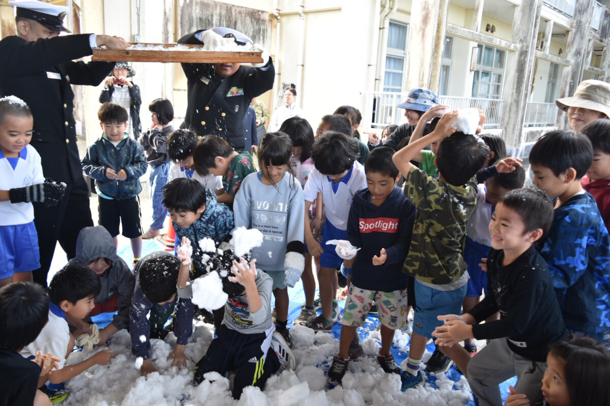 上野小学校で4日、海上自衛隊第5整備補給隊による「雪のプレゼント」が行われた。青森県から航空機で運ばれた本物の雪に、1、2年生計78人が大はしゃぎ。雪だるま作りや雪合戦を通して、宮古島では味わえない冬の自然の感触を全身で楽しんだ。