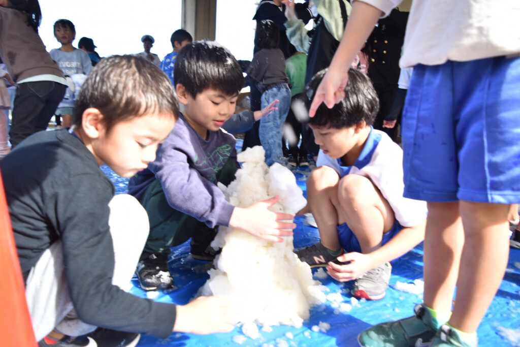 校内に設けられた会場に雪が広げられると、児童らは一斉に駆け寄り「冷たい!」「ふわふわしている」と大歓声。真っ白な雪を固めて小さな雪だるまを作ったり、友だちと雪をかけ合ったりと、思い思いに冬の贈り物を満喫した。