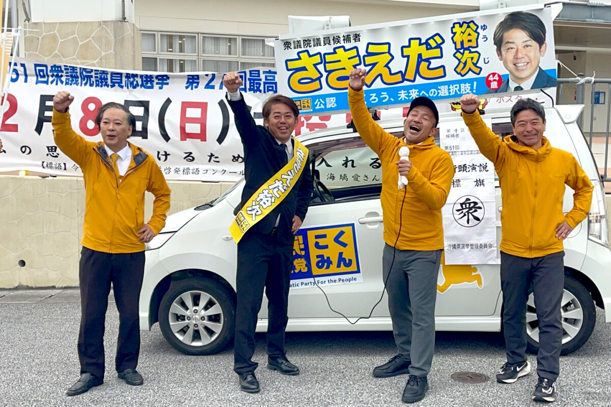 国民民主党崎枝裕次陣営の打ち上げ式は7日、豊見城市役所前で行われた。会場には支持者らが集まり、国政選挙に挑む崎枝候補を送り出そうと気勢を上げた。選挙戦を通じて沖縄4区各地を回った崎枝候補は、最後まで声を張り上げ、支持を呼び掛けた。