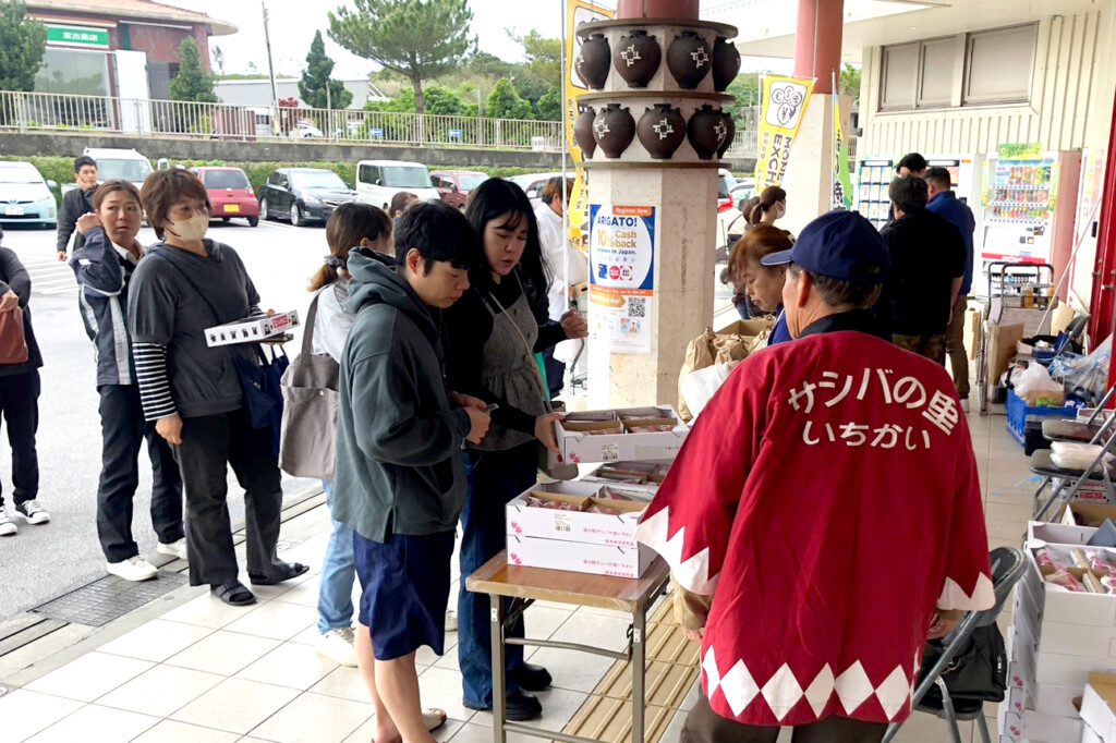 山鹿市宮古島交流推進協議会の立山和宏会長は「15分での完売に驚いている。明日は市貝町さんの販売も全力でお手伝いしたい」と話し、市貝町交流促進協議会の高徳義男事務局長は「最終日も朝からイチゴや生そばを並べるので、ぜひ早めに足を運んでほしい」と呼び掛けている。